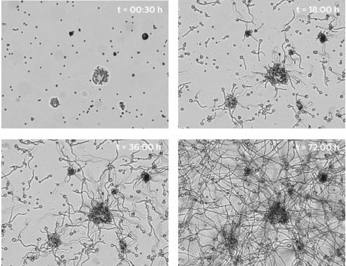 將一個新的流動池通過一個微流泵連接到oCelloScope微生物生長動態監測系統,實驗材料是真菌孢子和混合培養的生物膜。流速是75-400 μL/min,這樣就不會把細菌或真菌沖掉。oCelloScope微生物生長動態監測系統可得到圖片和延時視頻。