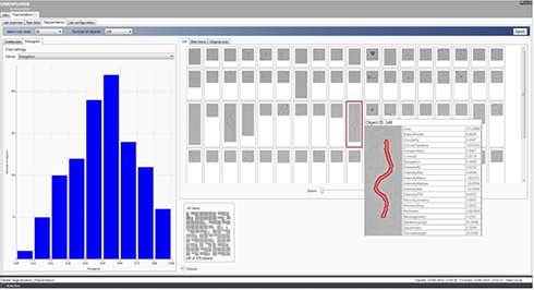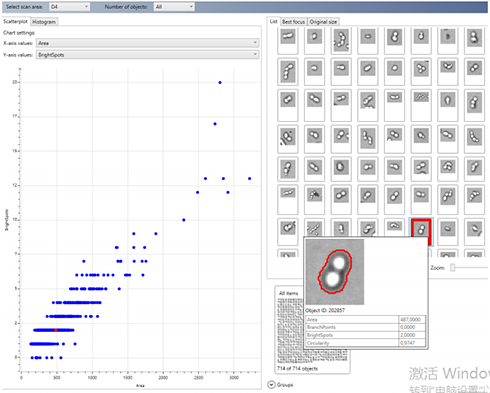 在散點圖和直方圖中,可以計算和可視化20多個形態特征,包括每個單個對象的細胞大小和形狀因子,使用戶能夠對所需對象進行分組,并分析所需組隨時間的形態變化。例如,可以在真菌或細菌產孢實驗中對營養細胞和孢子進行區分。
