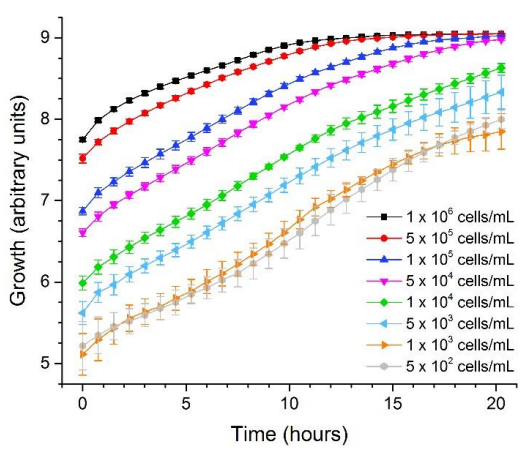 將8種不同的起始濃度(5×102 –1×106 個細胞/mL)在30℃的0.22μm過濾蘋果汁中培養20小時。使用背景校正吸收(BCA)算法,數據顯示為平均值±S.D.(n=4)。