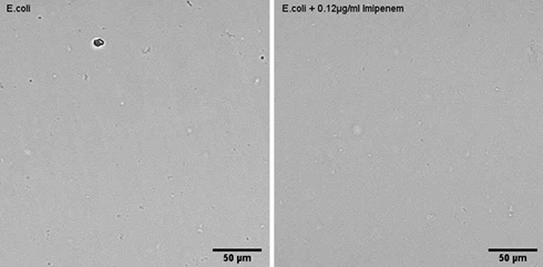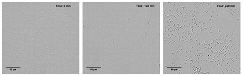 指數生長期細菌稀釋至1×107 cell/mL,一式三份加入96孔板(100微升/孔)。每15分鐘用顯微鏡測量一次生長情況。