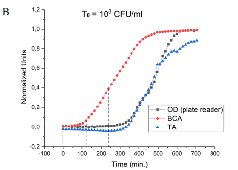 與標準方法相比,系統具有更高的靈敏度,這是通過專門的嵌入式圖像分析算法實現的,該算法能夠檢測單個細胞,定量分析濃度低至約103cfu/ml的生長。