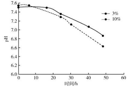生長曲線兩種接種濃度豬鼻支原體生長曲線見圖1和圖2。從圖1可以看出,以3%濃度接種,豬鼻支原體在0~48 h活菌濃度平穩上升,生長速率逐漸升高。以10%濃度接種,豬鼻支原體在0~48 h活菌濃度持續上升,0~6 h為遲緩期,6~48 h為對數期,其中24~30 h生長速率最快。從圖2可以看出,0~48 h內,兩種濃度接種菌液pH值變化范圍和趨勢大致相同,變化范圍為6.63~7.55。3%濃度接種,0~16 h內,pH值下降平緩,16~48 h pH值下降速度較快。10%濃度接種,0~6 h內,pH值下降平緩,6~48 h pH值下降速度較快,且10%比3%pH值下降更快。