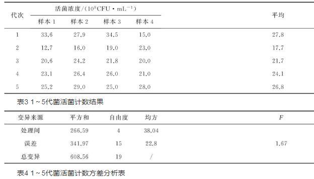 1~5代菌活菌計數結果活菌計數結果見表3。各代次間活菌濃度進行差異分析結果見表4,F=1.67
