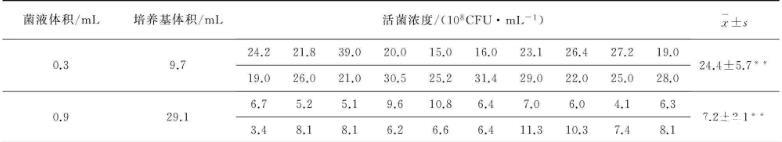 不同傳代體積差異比較從表5可以看出兩種傳代體積豬鼻支原體不同生長情況,“0.3 mL菌液加入9.7 mL培養基”這種體積構成的傳代方式下,20組菌液濃度平均值為24.4×108CFU/mL,標準差5.7;“0.9 mL菌液加入29.1 mL培養基”這種體積構成的傳代方式下,20組菌液濃度平均值為7.2×108CFU/mL,標準差2.1;用雙樣本異方差假設下t檢驗對這兩組實驗數據進行分析,兩種傳代方式下活菌濃度之間差異極顯著。