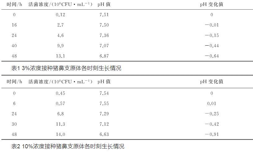 本試驗通過活菌計數和pH值測定,首次確定了豬鼻支原體適宜傳代比例、收獲時間、菌種代次以及傳代體積。