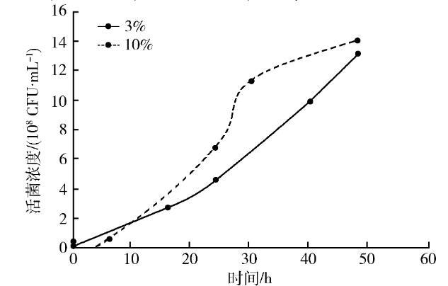 不同接種濃度活菌濃度和pH值的比較兩種濃度接種的豬鼻支原體各時間點的活菌濃度和pH值如表1和表2所示。從表1可以看出,3%濃度接種的豬鼻支原體0~48 h活菌濃度持續上升,到48 h達到峰值13.1×108CFU/mL,菌液pH值則持續下降,在40~48 h之間某時刻降至7.0以下。從表2可以看出,10%濃度接種的豬鼻支原體0~48 h活菌濃度持續上升,到48 h達到峰值14.0×108CFU/mL,菌液pH值則持續下降,在30~48 h之間某時刻降至7.0以下。