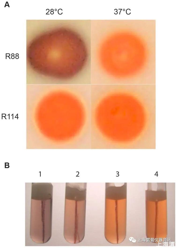 圖4、群體感應調節糖的發酵。(A)在含有剛果紅和0.2%麥芽糖的LB平板上生長96小時后的菌落表型,并在指示溫度下孵育。鼠疫桿菌將麥芽糖發酵成酸,將剛果紅轉化為黑,而yspIR ypeIR突變體則不會。這種發酵不會發生在溫度超過30度或其他糖的條件下。(B)鼠疫桿菌在固體培養基上厭氧培養96 h,培養溫度為28度。剛果紅是一種指示劑染料,在生產發酵最終產品時變暗。R114和R115中yspIR和ypeIR的缺失導致了麥芽糖在厭氧條件下發酵的滯后。1=Y.假結核桿菌;2=R88;3=R502;4=R115