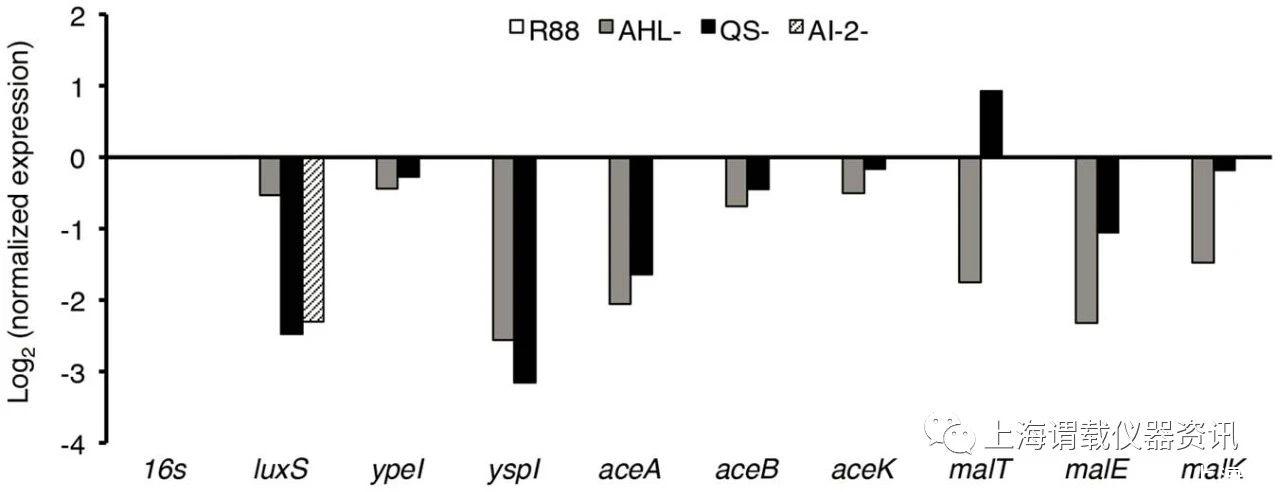 圖2、Ahl的QS調節次生代謝。從指定菌株中分離RNA,按材料和方法采用qRT-PCR檢測mRNA水平。數據代表了每個突變體與R88品系之間轉錄差異的三倍測量平均值,R88品系的轉錄差異歸一化為每個樣本的16S rRNA,代表了至少三個獨立實驗。