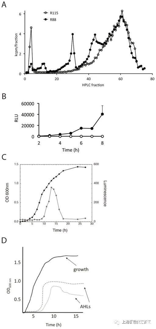 圖1、鼠疫桿菌群體感應分子的鑒定。圖A表示的是R88 Y.鼠疫菌(實心圓)與R115 QS-Y.鼠疫菌(空心圓)生產的14C標記AHL的HPLC分餾圖譜。圖B表示的是通過在指定的時間點將無細胞上清液添加到一株會對AI-2反應為生物發光(RLU)的V.harveyii報告株中進行監測,監測R88 Y.鼠疫桿菌(實心圓)和R115菌(空圓)生長過程中產出AI-2和AHL的情況。圖C和圖D分布表示的是AI-2(C)和AHL(D)的生長情況。