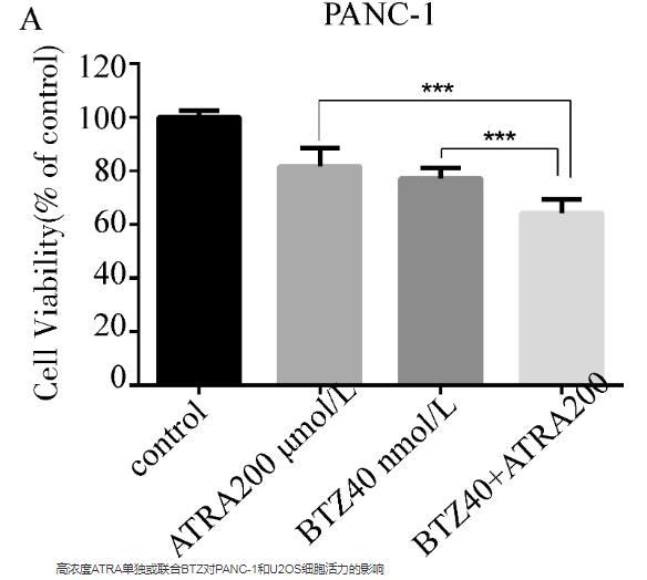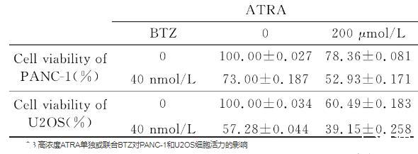 為進(jìn)一步檢測(cè)BTZ對(duì)ATRA作用的影響,我們繼續(xù)進(jìn)行了高濃度ATRA聯(lián)合BTZ的用藥實(shí)驗(yàn)。采用200μmol/L ATRA和40 nmol/L BTZ單獨(dú)或聯(lián)合處理PANC-1或U2OS細(xì)胞24 h,MTS實(shí)驗(yàn)檢測(cè)細(xì)胞活力。結(jié)果顯示,高濃度的ATRA可以顯著抑制PANC-1和U2OS細(xì)胞的生長(zhǎng)(P<0.001),聯(lián)合應(yīng)用ATRA和BTZ可明顯抑制PANC-1和U2OS細(xì)胞的生長(zhǎng)(P<0.001)(圖2,表2),與單獨(dú)應(yīng)用ATRA相比,聯(lián)合用藥組都具有顯著差異(PANC-1,P<0.001;U2OS,P<0.01);與單獨(dú)應(yīng)用BTZ相比,聯(lián)合用藥同樣具有顯著差異(P<0.01)(圖2)。