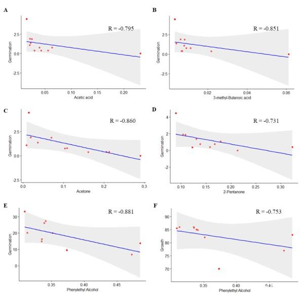圖4、化合物的相對發(fā)芽率或菌絲生長速率與相對峰面積之間的spearman相關系數散點圖。(A)y軸:羅氏白僵菌發(fā)芽率;x軸:乙酸峰面積;(B)y軸:羅氏白僵菌發(fā)芽率;x軸:3-甲基丁酸的峰面積;(C)y軸:逆色芽萌發(fā)率;x軸:丙酮峰面積;(D)y軸:逆色芽孢桿菌的發(fā)芽率;x軸:2-戊烷的峰面積;(E)y軸:逆色芽孢桿菌的萌發(fā)率;x軸:2-苯乙醇的峰面積;(F)y軸:逆色偃麥草菌絲生長速率;x軸:2-苯乙醇的峰面積。