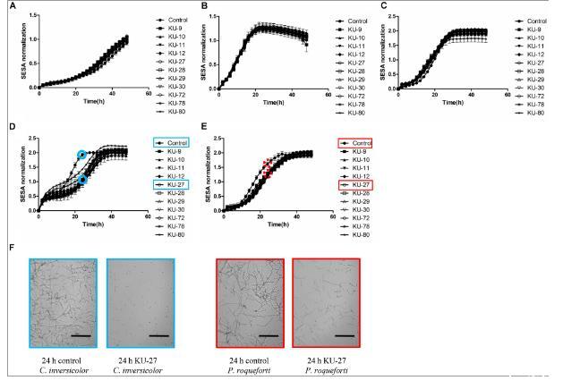 圖2、來自D.hansenii菌株KU-9、KU-10、KU-11、KU-12、KU-27、KU-28、KU-29、KU-30、KU-72、KU-78和KU-80對使用oCelloScope TM測量為標準化SESA單位的五種霉菌的生長情況。(A)Cladosporium sinuosum,(B)鐮刀菌,(C)毛霉菌,(D)Cladosporium inversicolor,(E)Penicillium roqueforti。每個點代表三個獨立實驗的平均值,誤差條代表標準偏差。(F)oCelloScope監(jiān)測C.inversicolor(藍色)和P.roqueforti(紅色)在酵母蛋白胨培養(yǎng)基(對照)中或在D.hansenii菌株KU-27的無細胞上清液存在下24小時的生長測量實時圖像。這些研究結果表明D.hansenii無細胞上清液主要以霉菌物種依賴性方式影響萌發(fā)階段,而不是以D.hansenii菌株依賴性方式。