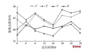 對各試驗柱氨氮去除效率進行分析,結(jié)果見圖3。由圖3可見,4組試驗柱對氨氮去除效率由高至低依次為2#>1#>4#>3#,其氨氮平均去除率分別為45.50%、43.16%、40.98%、39.60%,環(huán)境溫度為15℃的1#、2#試驗柱對氨氮去除效果高于環(huán)境溫度為5℃的3#、4#試驗柱。在相同環(huán)境溫度下,反級配試驗柱對氨氮去除效率高于正級配試驗柱。結(jié)合表4可知,雖然3#、4#試驗柱的硝化細(xì)菌數(shù)量均多于1#、2#試驗柱,但低溫環(huán)境抑制了硝化細(xì)菌的活性,影響其硝化效率,同時低溫條件下氨化細(xì)菌數(shù)量減少使得進水中有機氮氨化效率降低,減少了硝化反應(yīng)所需氨氮底物濃度,亦是造成3#、4#試驗柱硝化細(xì)菌數(shù)量高而硝化效果卻低于1#、2#試驗柱的原因之一。