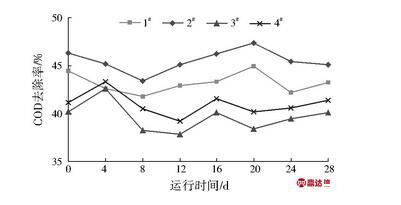 對4組試驗柱的COD去除效果進行對比分析,結(jié)果見圖2。由圖2可見,各試驗柱對COD的去除效率由高至低排序為2#>1#>4#>3#,其COD平均去除率分別為46.18%、44.58%、40.91%、40.13%。環(huán)境溫度為15℃時,2#試驗柱對COD去除效率高于1#試驗柱,在環(huán)境溫度為5℃時,4#試驗柱對COD的去除效率略優(yōu)于3#試驗柱,但差異較小,COD去除效果與試驗柱內(nèi)氨化細(xì)菌數(shù)量監(jiān)測結(jié)果總體一致。
