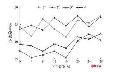 對試驗期間各試驗柱TN去除效果進行檢測,結(jié)果見圖4。1#~4#試驗柱對TN的平均去除率分別為44.58%、45.28%、38.06%、39.63%,環(huán)境溫度為15℃的1#、2#試驗柱脫氮效率高于5℃下的3#、4#試驗柱,說明環(huán)境溫度是制約人工濕地脫氮效率的首要因素。其次,由于相同條件下反級配試驗柱硝化效率更好,對氨氮的去除效果更高,為后續(xù)反硝化提供了更多的硝態(tài)氮底物,故雖然試驗過程中正級配試驗柱的反硝化細(xì)菌數(shù)量高于反級配試驗柱,但相同反應(yīng)溫度下反級配試驗柱對總氮的去除率更高,可見供給反硝化脫氮的底物濃度亦是制約脫氮效率的重要因素。由于潛流濕地設(shè)計水力停留時間普遍在24 h以上,在較長的反硝化時間下,相對較少的反硝化細(xì)菌數(shù)量亦可完成對硝態(tài)氮的反硝化反應(yīng),故相較于濕地填料層中反硝化細(xì)菌數(shù)量,填料層中供給反硝化脫氮的硝態(tài)氮底物濃度是影響濕地脫氮效果更重要的制約條件。
