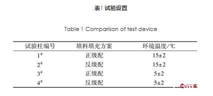 試驗裝置為4根直徑250 mm,高100 cm的有機玻璃柱(見圖1),沿有機玻璃柱體垂直方向表層、中層、底層3個位置設(shè)置內(nèi)螺紋閥形取樣口,以便于在試驗過程中對不同填料層斷面微生物取樣分析。將2根有機玻璃柱采用傳統(tǒng)正級配填料方案進行填充,自柱底至上依次鋪設(shè)粒徑8~10 mm圓形卵石30 cm,粒徑5~8 mm礫石30 cm,粒徑3~5 mm細(xì)砂30 cm。另外兩個有機玻璃柱采用反級配填料方案進行填充,自柱底至上依次鋪設(shè)粒徑3~5 mm煤矸石30 cm,粒徑5~8 mm無煙煤30 cm,粒徑8~10 mm沸石30 cm。試驗于冬季進行,將1根正級配柱和1根反級配柱安裝于有供暖的實驗室內(nèi),控制試驗期間實驗室內(nèi)環(huán)境溫度為(15±2)℃;將另1根正級配柱和1根反級配填料裝置安裝于可調(diào)節(jié)溫度的低溫實驗室內(nèi),控制試驗期間低溫實驗室內(nèi)環(huán)境溫度為(5±2)℃。4根試驗柱的填料級配、試驗溫度設(shè)置見表1。
