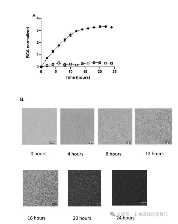 圖1、(A)添加TSB后干燥腸炎沙門氏菌的生長,使用oCelloScope測量并在24小時內量化(●)。使用背景校正吸收(BCA)算法分析生長。歸一化值是根據初始時間點(0 h)的BCA值計算的。不含腸炎沙門氏菌的TSB用作陰性對照(□)(B)oCelloScope圖像顯示TSB中腸炎沙門氏菌的細菌數量隨時間增加。明場圖像表明細菌的數量逐漸增加,直到大約16小時,之后細菌密度太高,BCA算法無法計算。