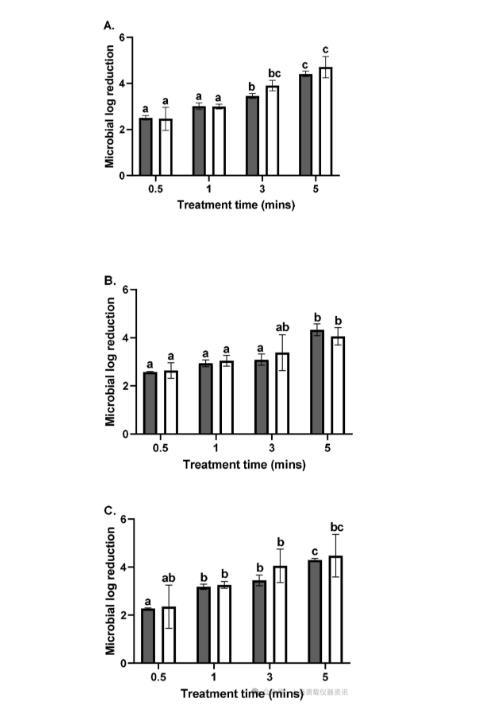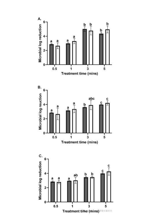 圖3、在NaOCl處理30秒、1分鐘、3分鐘和5分鐘后,使用BCA算法(灰色條)與傳統MLR量化測定(平板計數,白色條)比較微生物對數減少(MLR)。在用100 ppm游離氯處理粉狀的腸炎沙門氏菌(A)、大腸桿菌O157:H7(B)和單核細胞增生李斯特菌(C)細胞不同時間后,對MLR進行量化。相對于未處理的粉狀細菌的陰性對照計算對數減少(使用零時間的數據點)。使用雙向方差分析進行統計分析。對于每張圖,不同的字母在統計上是不同的。
