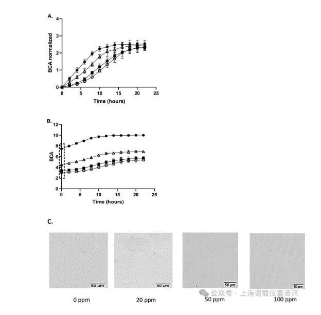 圖2、使用oCelloScope監測NaOCl處理后存活的腸炎沙門氏菌細胞的生長。用不同濃度的NaOCl處理微量滴定板中的細菌5分鐘,然后加入TSB+0.1%硫代硫酸鈉,并使用oCelloScope在室溫下監測生長24小時。使用(A)標準化BCA算法和(B)BCA(無標準化)算法繪制微生物的生長數據。用不含氯(●)、20 ppm游離氯(△)、50 ppm游離氯(■)或100 ppm游離氯(○)的溶液處理腸炎細胞。BCA圖(虛線框,B)零時間的數據點用于計算BCA減少。(C)oCelloScope圖像在用0、20、50或100 ppm游離氯處理后在零時間獲得的細菌的數量。