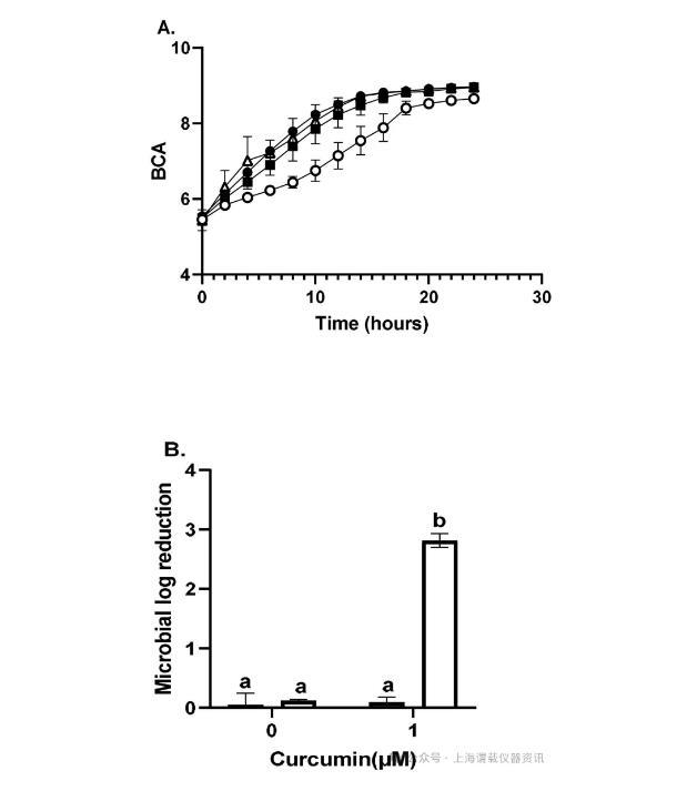圖5、在存在或不存在姜黃素的情況下照射后大腸桿菌O157:H7的微生物對數減少(MLR)。(A)使用oCelloScope測量處理后存活的大腸桿菌O157:H7的生長。大腸桿菌O157:H7未經處理(無輻照或姜黃素,●)、無姜黃素輻照(■)、1μM姜黃素無輻照(△)和在1μM姜黃素存在下輻照(○)。(B)使用或不使用姜黃素(1μM)照射后,使用BCA算法(灰色條)與傳統MLR量化測定(白色條)比較微生物對數減少(MLR)。相對于未處理的陰性對照計算對數減少。使用雙向方差分析進行統計分析