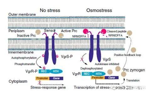 圖5、VgrS蛋白水解引起的細菌應激反應模型。當細菌在滲透脅迫下生長時,Prc被激活并分裂n端肽(NRNIDFFA)對VgrS的感測區具有抑制作用,導致后者的自身磷酸化。