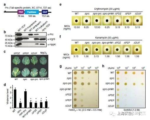 圖1、圖a表示的是Prc蛋白質二級結構示意圖。圖b表的是Prc蛋白是位于細菌周質和細胞溶膠中,采用的是采用Western blot技術檢測不同細胞組分的Prc蛋白。圖c表示的是Prc的失活導致了細菌的毒力的不足。圖d表示的是在圖c中對應的菌株的毒性評價圖,采用了半定量標準測定了菌株的毒力水平。圖e、f表示的是該突變體對多種抗生素(紅霉素e和卡那霉素)敏感性。圖g表示的是Pcr的失活導致了對鐵脅迫的過敏,菌株的培養是在含有2.5mM FeSO4+0.5mM維生素C的NYG瓊脂上,于28℃條件下培養72 h。圖h表示的是Prc的失活導致了對滲透應力的過敏。
