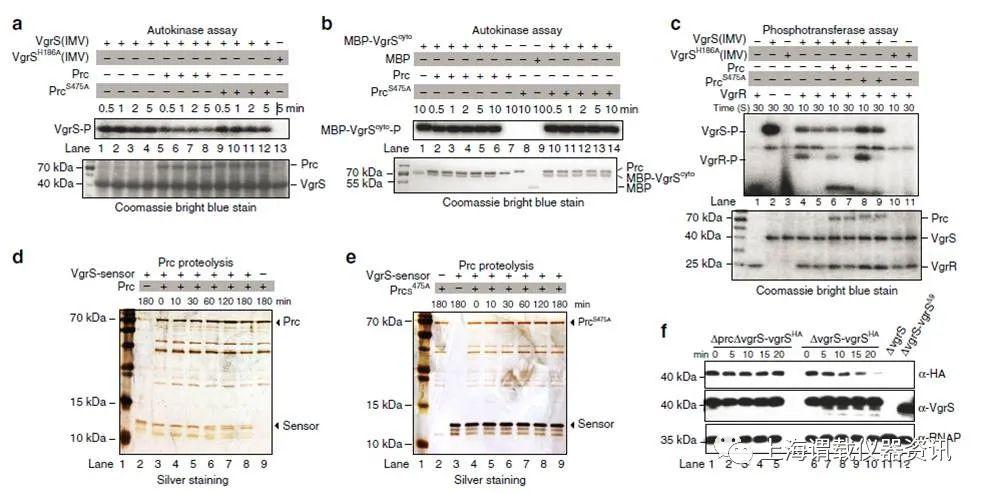 圖3、Prc通過切割VgrS的敏感區域來抑制其自身激酶活性。圖a-圖c表示的是Prc以蛋白酶活性依賴的方式抑制全長VgrS的自磷酸化過程。圖d-圖e表示的是Prc在體外降解了VgrS感知寄主體。圖f表示的是Western blotting顯示Prc在體內降解n-末端HA-tags。