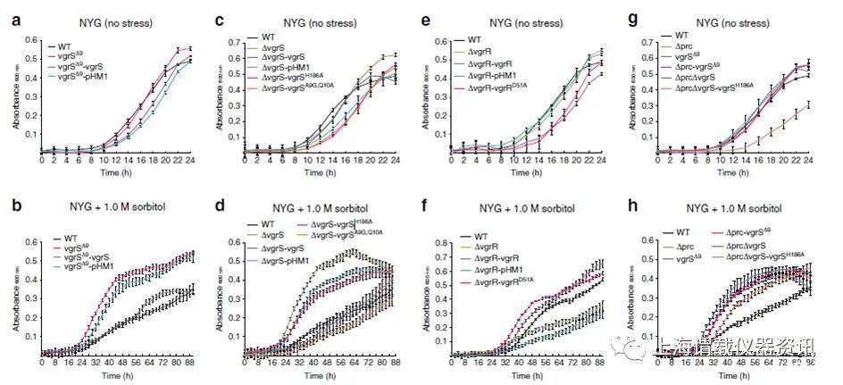 圖4、vgrS n端缺失抑制了突變體在滲透脅迫下的生長缺陷。圖a、c、e和g表示的是細菌在NYG培養基中的生長曲線圖。圖b、d、f和圖h表示的是細菌在NYG培養基加上1.0M山梨醇的生長曲線圖。用丹麥Biosense微生物生長動態監測系統測定其其相關的生長曲線分析圖。每個數據點是六個樣本的平均值。