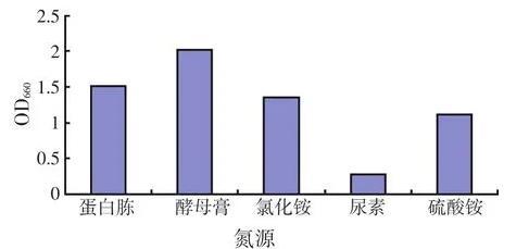 以甘油為碳源,磷酸氫二鉀為磷源,加入1.0 ml/l微量元素溶液,1.0 ml/l維生素溶液,再分別加入蛋白胨、酵母膏、氯化銨、尿素、硫酸銨為唯一氮源配制培養基,接種沼澤紅假單胞菌R1培養7 d后,試驗結果見圖2。由圖2可知,沼澤紅假單胞菌R1較適宜的氮源為酵母膏,其次為蛋白胨,但考慮到酵母膏、蛋白胨使生產成本高,營養豐富易造成染菌等因素,因此本試驗選擇氯化銨為氮源。