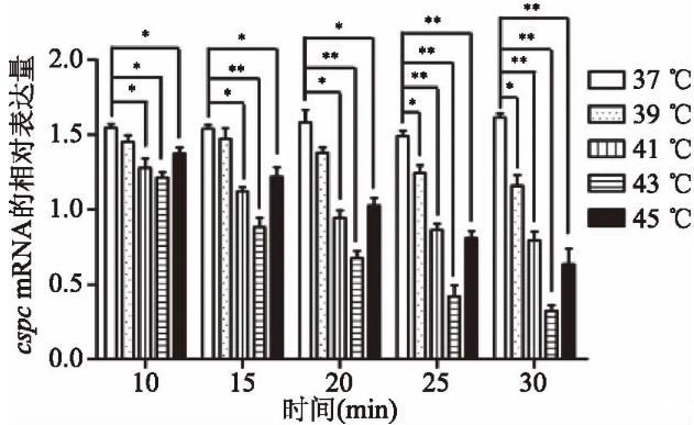 1.2.5溫度誘導cspcmRNA基因表達試驗將鼠李糖乳桿菌四級發酵液分別置于37、39、41、43、45℃的恒溫水浴中分別處理10、15、20、25、30 min,即按照5組(溫度)×5組(時間)設計,共25組試驗,每組試驗設3個重復,37℃為對照組。RT-PCR法檢測cspcmRNA基因的表達量[14]。