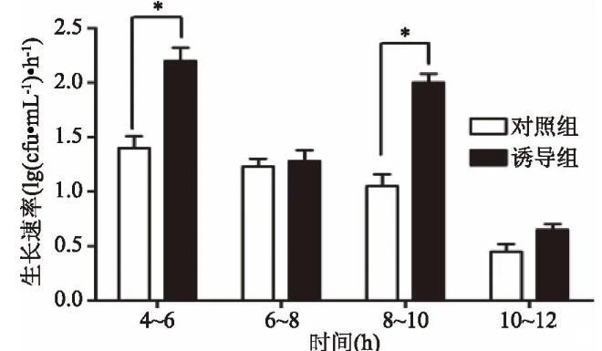 本研究中,通過升高溫度抑制菌體cspcmRNA基因的表達,結果如圖4所示,在接種后生長第4和8 h,菌體經43℃、30 min誘導,菌體cspcmRNA基因的表達明顯降低,而隨著溫度降至37℃,cspcmRNA基因的表達又恢復到原來水平。如圖5所示,經過誘導后的鼠李糖乳桿菌生長明顯加快,且活菌數明顯升高。如圖6所示,經過兩次誘導后,與對照組相比,誘導組4~6 h以及8~10 h的生長速率明顯增高,差異顯著(p<0.05),而6~8 h和10~12 h兩組的生長速率差異不顯著。