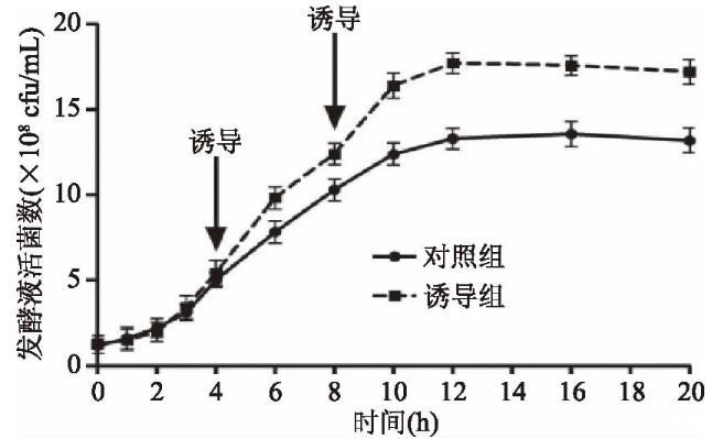 1.2.3生長曲線測定四級發酵液按不同的時間點(0、1、2、3、4、6、8、10、12、16、20 h)取樣,測定發酵液活菌數,制作生長曲線。
