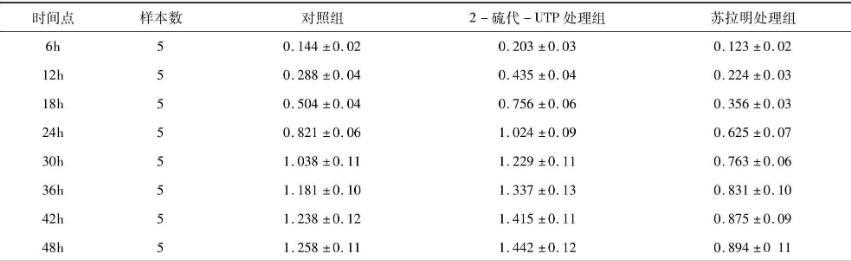 各處理組細胞8個時間點的活性檢測結果如表1所示,根據表1繪制細胞生長曲線(見圖1)。結果顯示,2-硫代-UTP處理組細胞較對照組生長速率明顯加快,以第24h時間點生長速率出現最大值,且達到平臺期所用時間也有所縮短。蘇拉明處理組細胞生長速率均顯著低于對照組和2-硫代-UTP處理組,且未出現細胞接觸抑制現象。