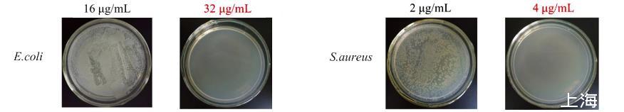 以MIC為界,將MIC及其后未長菌試管和MIC的前一個試管中的培養液取200μL轉移到干凈的固體LB培養基上,涂板并在37℃全溫搖床中孵育12 h,觀察細菌生長情況,結果見圖5。對于E.coli,Cu2-xSe NCs的最小殺菌濃度MBC為32μg/mL,而對于S.aureus,Cu2-xSe NCs的最小殺菌濃度MBC則為4μg/mL。