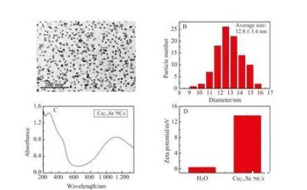 圖2 Cu2-xSe NCs的表征。(A)Cu2-xSe NCs的透射電鏡(TEM)圖像;(B)Cu2-xSe NCs的粒度分布,其通過在視野中隨意計數100個顆粒而獲得;(C)Cu2-xSe NCs的UV-Vis吸收光譜;(D)Cu2-xSe NCs和H2O的Zeta電位