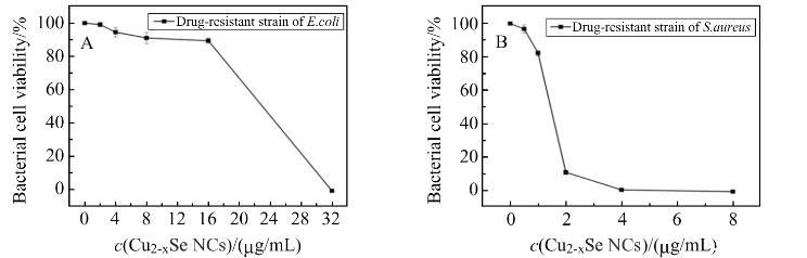 圖6 Cu2-xSe NCs對E.coli耐藥菌株(A)和S.aureus耐藥菌株(B)細菌存活率的影響