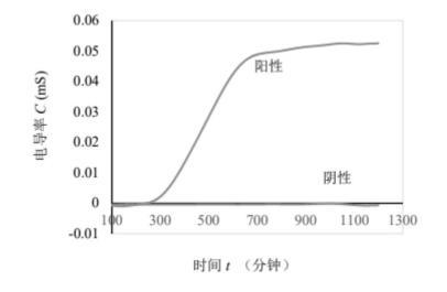 將從臨床送檢的導(dǎo)管尖端放置到預(yù)先裝滿蛋白胨水的專(zhuān)用檢測(cè)管中,將檢測(cè)管封口后插入電子微生物生長(zhǎng)分析儀,電子微生物生長(zhǎng)分析儀全自動(dòng)在線監(jiān)測(cè)并繪制出非接觸電導(dǎo)(C)-時(shí)間(t)曲線。從電子微生物生長(zhǎng)分析儀自動(dòng)報(bào)告的細(xì)菌生長(zhǎng)曲線形狀直接讀出結(jié)果(培養(yǎng)45000s內(nèi)):電導(dǎo)率值(NACV)>0.02V,說(shuō)明導(dǎo)管尖存在細(xì)菌或真菌;電導(dǎo)率值(NACV)<0.02V或水平線,說(shuō)明沒(méi)有細(xì)菌或真菌生長(zhǎng)。細(xì)菌的生長(zhǎng)代謝過(guò)程由電子微生物生長(zhǎng)分析儀全自動(dòng)在線監(jiān)測(cè)并繪制出非接觸電導(dǎo)(C)-時(shí)間(t)曲線。測(cè)定結(jié)束后根據(jù)C-t曲線的形狀及電導(dǎo)率值判斷導(dǎo)管尖是否有細(xì)菌生長(zhǎng)。