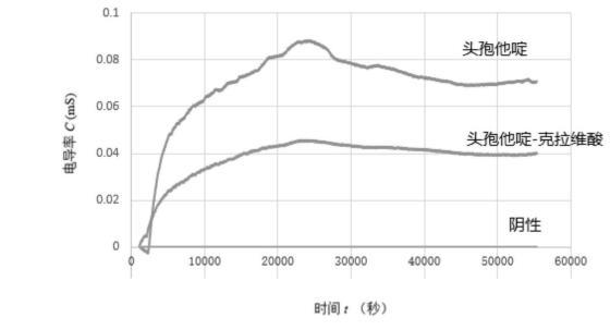 步驟四、對(duì)應(yīng)陰性對(duì)照、含有頭孢他啶(16mg/L)、頭孢他啶-克拉維酸(16/4mg/L)的蛋白胨水的C-t曲線如圖2所示。其中陰性對(duì)應(yīng)一條直線,說(shuō)明檢測(cè)體系未被污染。含有頭孢他啶(16mg/L)比頭孢他啶-克拉維酸(16/4mg/L)在培養(yǎng)45000s內(nèi),兩管電導(dǎo)率值差值(NACV’)>0.02V。說(shuō)明體系中細(xì)菌能夠正常生長(zhǎng)代謝且產(chǎn)生超廣譜β內(nèi)酰胺酶(即具有耐藥性)。通過(guò)是否產(chǎn)生超廣譜β內(nèi)酰胺酶判斷細(xì)菌是否具有耐藥性。