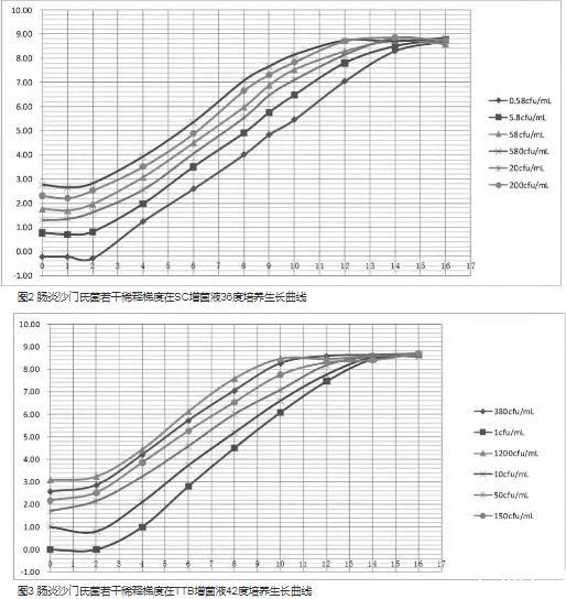 圖2腸炎沙門氏菌若干稀釋梯度在SC增菌液36度培養(yǎng)生長(zhǎng)曲線
