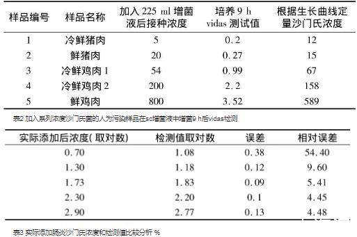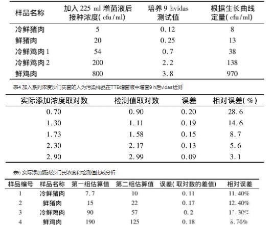 表2加入系列濃度沙門氏菌的人為污染樣品在sc增菌液中增菌9 h后vidas檢測(cè)