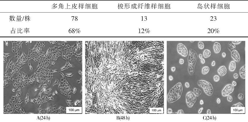 A.多角上皮樣細胞(×100);B.梭形成纖維樣細胞(×100);C.島狀樣細胞(×100)
