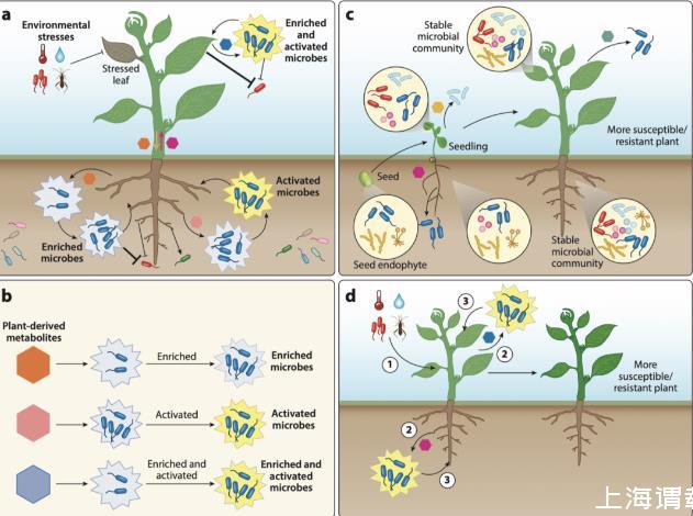 圖2植物對微生物的選擇性調控。(a)植物如何選擇性地招募和抑制微生物群落及影響其活性的機制概覽。箭頭和線條的粗細代表支持或抑制的不同強度。(b)微生物利用植物來源的代謝物質,導致它們的富集和激活,從而促進功能性反應。(c)在生長階段,宿主植物持續塑造其微生物群,組建一個穩定的微生物群落,這使得植物更易受感染或更具抵抗力。(d)在受到壓力時,宿主植物招募并激活特定的微生物,這可能有助于防御,或者在環境閾值超過植物調控能力的情況下,無意中促進病原體感染或加速植物死亡