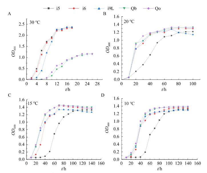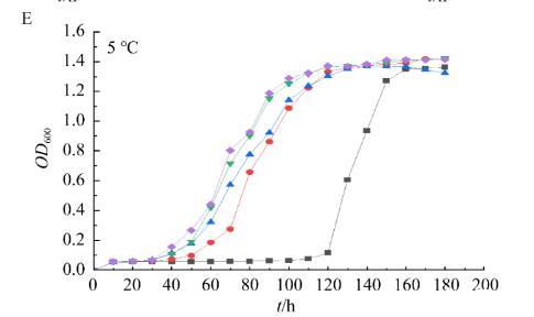 取OD600為0.1的菌懸液1 mL,轉接于50 mL的LB液體培養基中,在5、10、15、20、30℃條件下振蕩培養(180 r/min),測定不同培養時間下菌液的OD600值,并分別以培養時間和OD600值為橫坐標和縱坐標繪制菌株生長曲線。