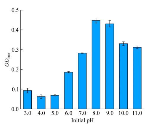 圖2初始pH對(duì)菌株CSW-1生長(zhǎng)的影響