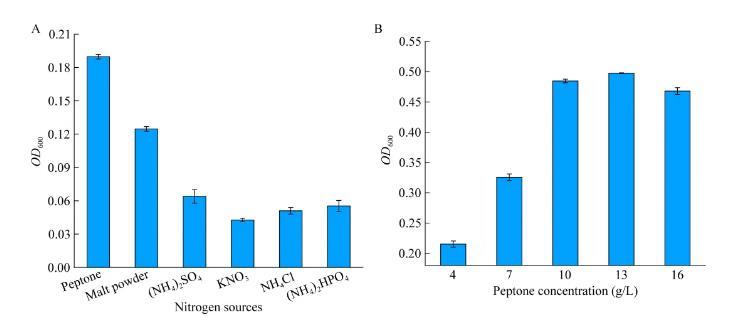圖7氮源對(duì)菌株CSW-1生長(zhǎng)的影響A:氮源種類(lèi).B:氮源濃度