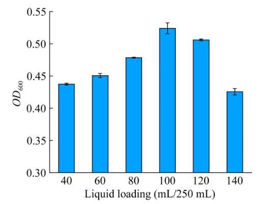 圖4裝液量對(duì)菌株CSW-1生長(zhǎng)的影響