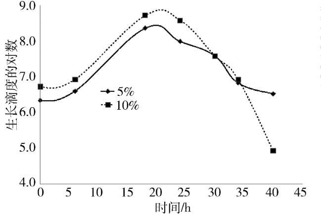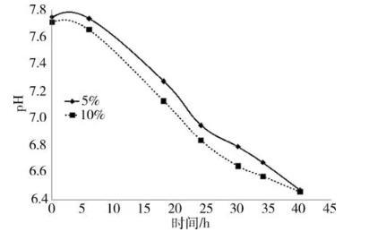 比較兩種接種濃度MS生長曲線和pH值變化情況見圖1~圖3。從圖1可以看出,接種濃度5%的MS 6~18 h活菌濃度增長更快,18~30 h活菌濃度更高;從圖2可以看出,接種濃度10%的MS 18~24 h生長滴度更高,24~40 h生長滴度下降更快;從圖3可以看出,同為pH持續下降的情況下,10%下降更快。