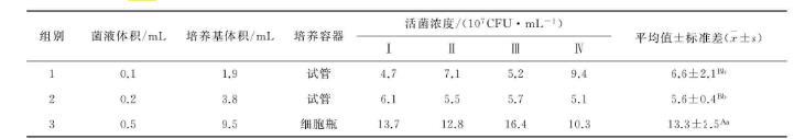 從表5可以看出兩種傳代體積MS不同生長情況,在菌液濃度樣本重復次數相同(n=4)的情況下,3組傳代方式的MS平均活菌濃度依次為(6.6±2.1)×107、(5.6±0.4)×107、(13.3±2.5)×107CFU/mL。對3組實驗數據進行單因素方差分析,利用最小顯著差數法(LSD法)對3組平均值進行多重比較,結果顯示:組1和組2無顯著差異,組3分別和組1、組2之間存在極顯著差異(P<0.01),就MS活菌濃度而言,組3傳代方式優于組1、組2,即用0.5 mL菌液接種9.5 mL培養基的方式更利于MS生長。