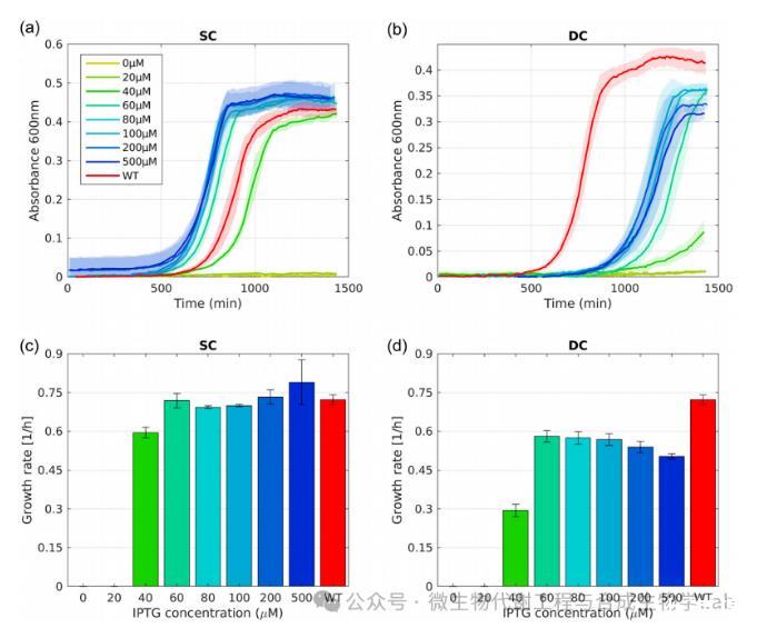 SC菌株表現出一種開關樣的誘導模式:對于低濃度的IPTG,菌株不生長,而高于閾值濃度,菌株的生長速度與WT菌株大致相同。為驗證在DC菌株中實現的ββ'‐和α‐亞基誘導控制的改進設計是否保留了這種開關表型。研究人員將SC和DC菌株在M9最小培養基中預培養,添加0.2%葡萄糖和250μM IPTG,以保證RNA聚合酶的表達和生長。將預培養物洗滌并重新稀釋到相同的培養基中,但添加了不同濃度IPTG,范圍為0至500μM。