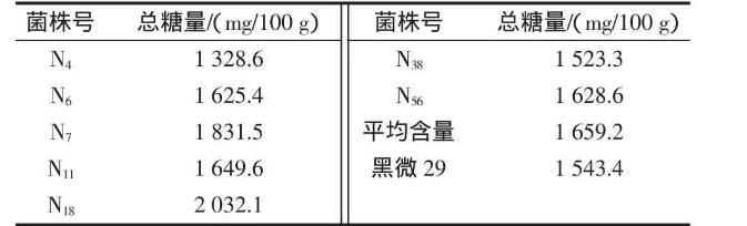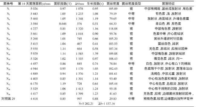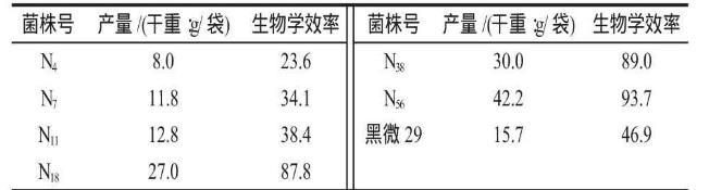 從表1可以看出,各菌株在菌落形態或菌絲蔓延速度上的特征均不相同。將各菌株的各項指標與對照菌株進行比較,得出的結果是N4、N7、N11、N18、N38、N56等6株菌株為比較理想的菌株。
